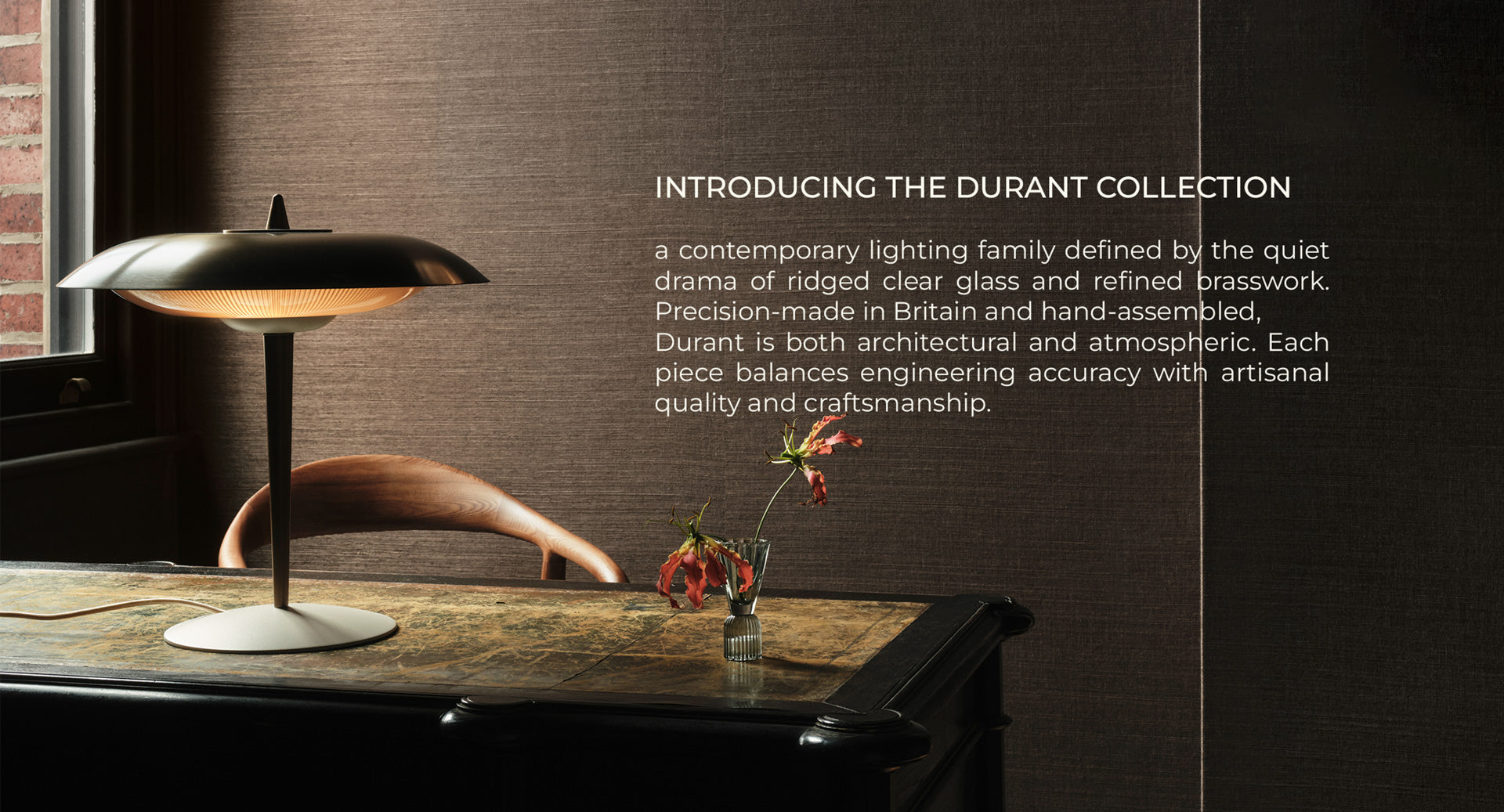 Designed and crafted in England, Durant reflects our commitment to enduring materials, clean geometries and thoughtful proportion. Each piece is intended to sit comfortably in residential or hospitality settings, either as a subtle complement or a confident focal point. Explore the Durant Collection and discover how its balanced forms and versatile finish palette bring a composed, timeless atmosphere to any space.