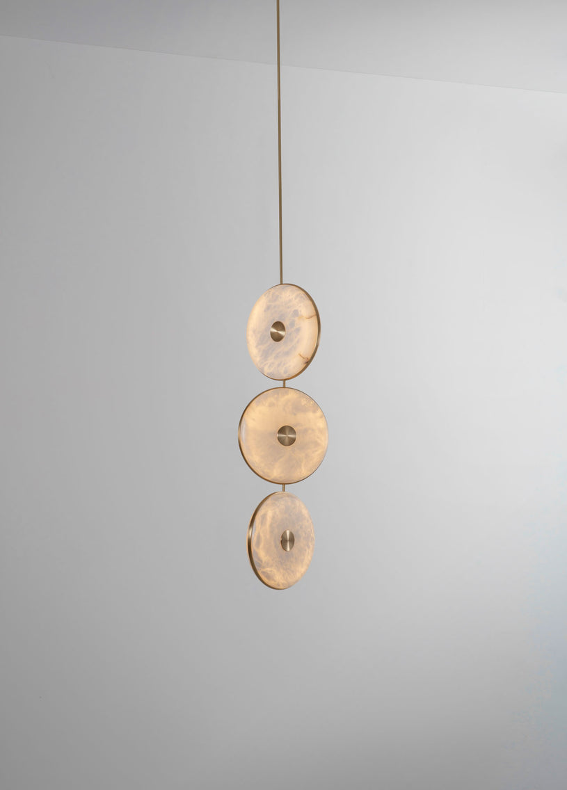 For the not-so-subtle trendsetter or a maximalist with courageous taste, the Drop Chandelier combines three of the large alabaster stone diffusers in a linear formation for a show-stopping delight that won’t be forgotten. The unique veining of each stone diffuser is particularly noticeable in this design, highlighting the inherent beauty in the natural material.