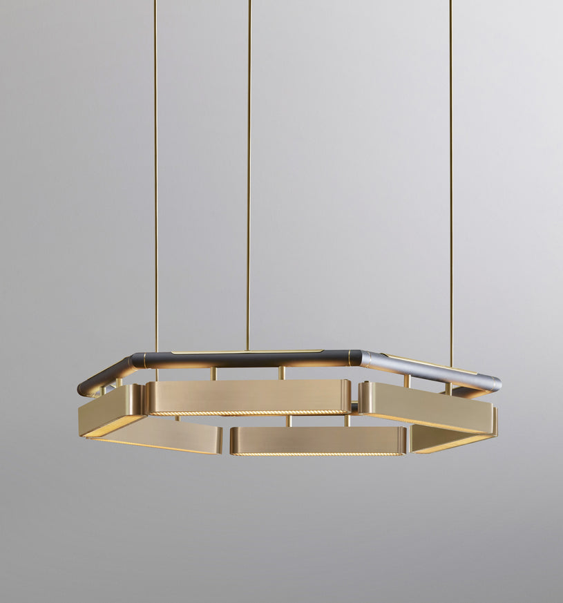 Experience geometric elegance with the Hexagon chandelier. Featuring six linear elements and triple machine-cast brass diffusers with slotted opal inserts.
