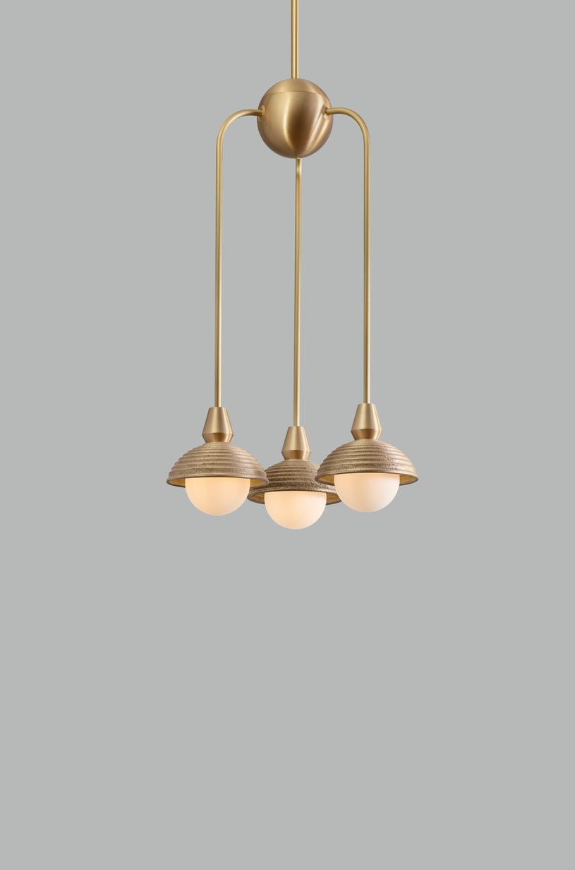 Crafted in England using traditional sand-casting techniques, this pendant features three configurations: two long rods, two short rods, or one short with two long rods. The frosted glass gently diffuses the light, and the multi-layered design offers a bold, yet refined aesthetic.