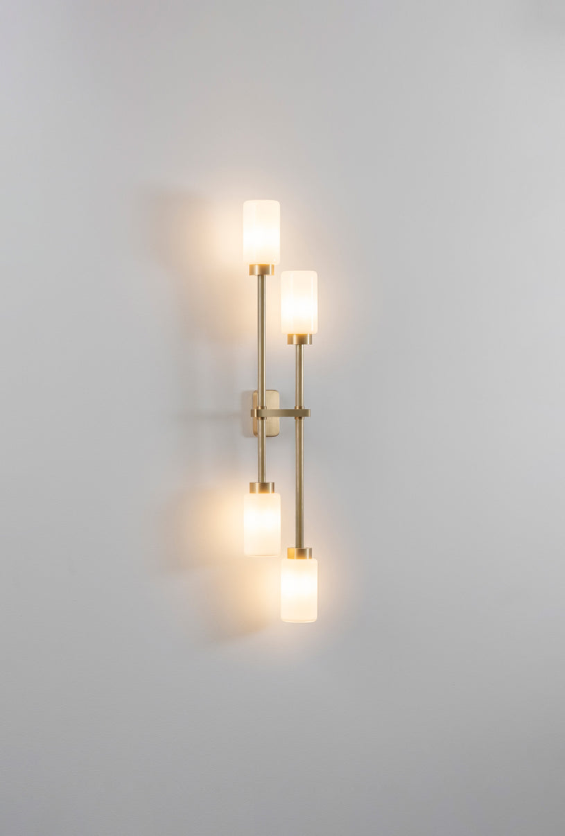 Crafted entirely from brass, the Farol Wall Double balances its bold lines with delicate cylindrical glass shades. With opal or smoked glass options, this light comes in right-hand or left-hand configurations, offering adaptability for any design scheme. The hand-blown glass shades from Poland reflect generations of craftsmanship, with unique air pockets adding a touch of individuality to each piece