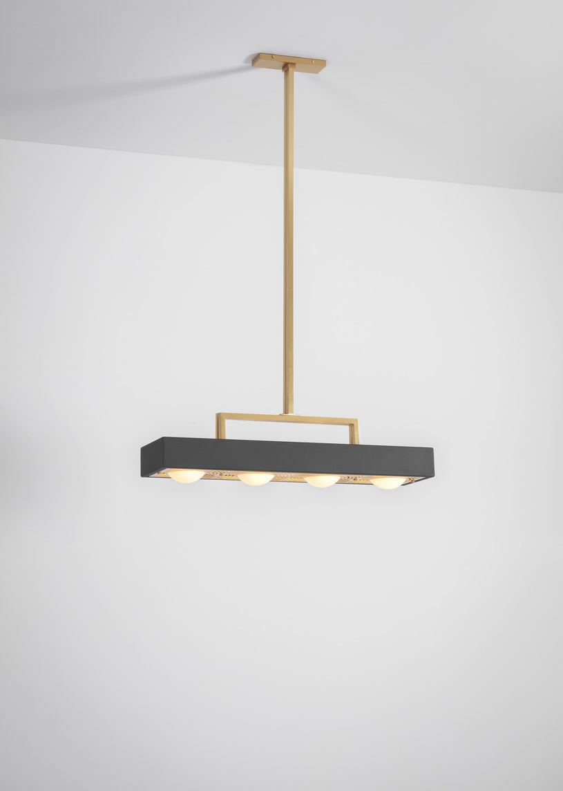 Clean, simple lines and repeating shapes. Kernel is composed of intersecting horizontal and vertical lines and geometric forms. Four opal glass spheres framed within a matte lacquered rectangular shade. Laser cut brass diffuser echoes the shape of the encased spheres, fluid and curving. An unexpected twist.
