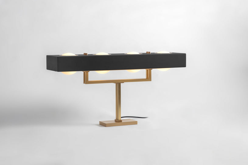 Solid brass base and angular form softened by the warm glow of opal glass globes. Unexpected detailing in the laser cut brass diffuser, seen only from below.