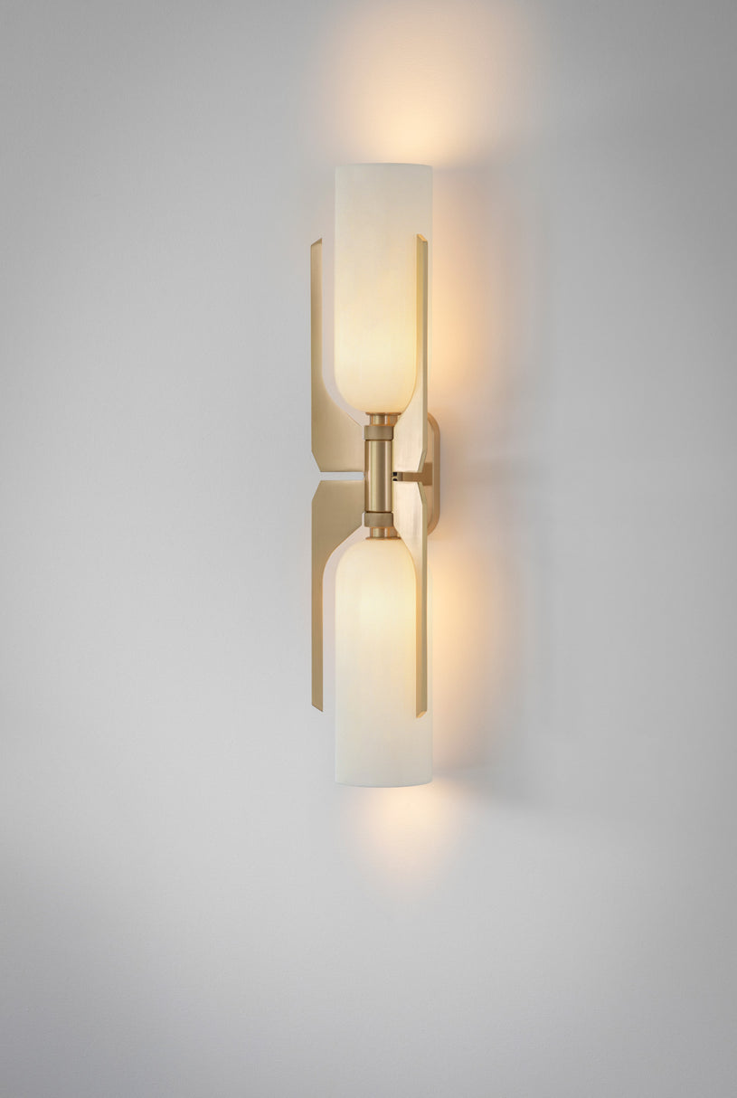 Solid brass edge-polished fins thrust upwards and downwards in perfect symmetry around opal glass diffusers; the frame secured to the wall with a machined brass plate.