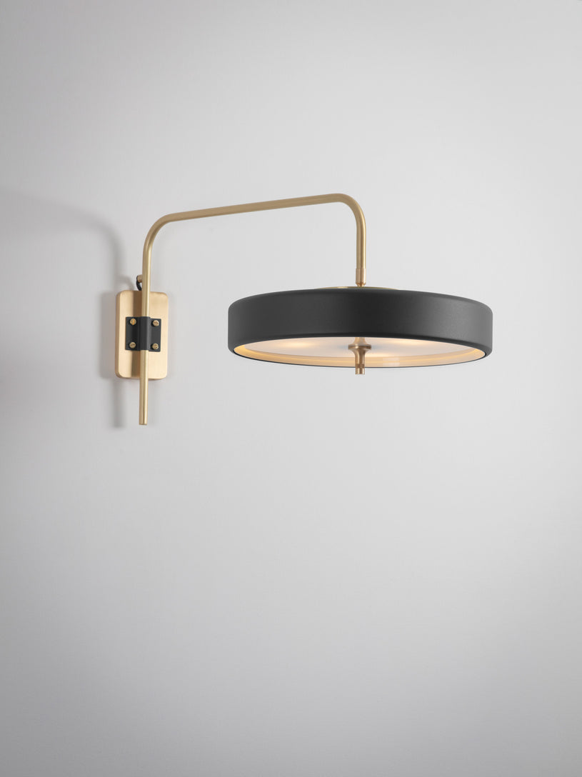 Sleek, minimalist design. Designed to rotate through 90 degrees in a perfect arc from the wall for maximum flexibility. Casts a soft, warm light from an opal diffuser, framed in a matte-lacquered spun-metal shade.