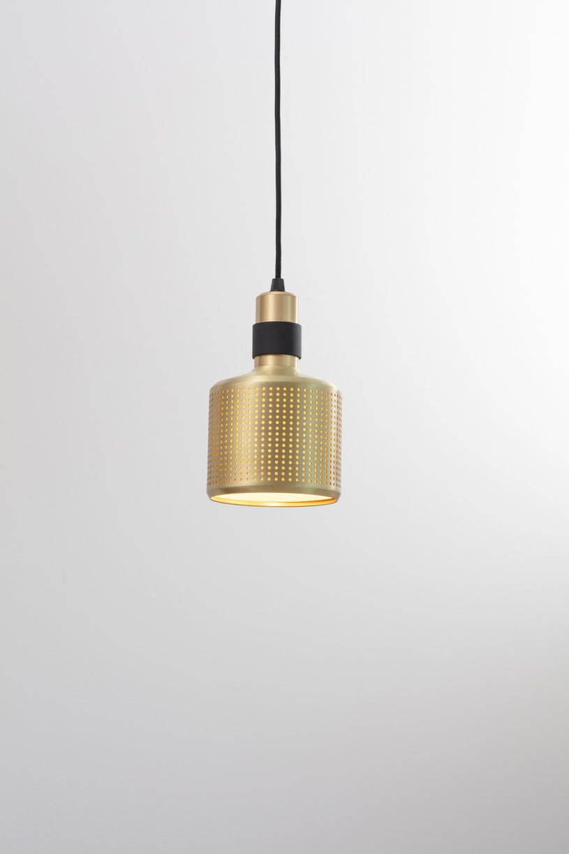 Riddle, our inaugural design. Perforated machined-brass shade with fabric insert to cast a soft, warm light. Versatile enough to position over a bedside table, kitchen island or breakfast bar.