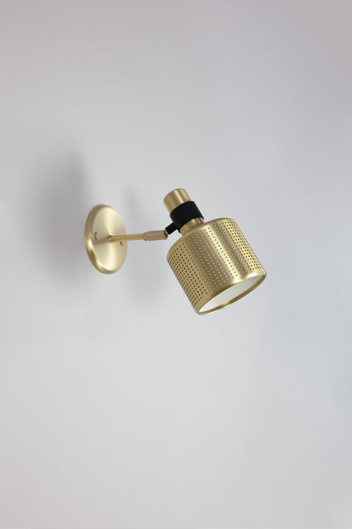 Perforated machined-brass shade with a fabric insert for a warm glow of directional light. Toggle switch on the solid brass powder-coated base.
