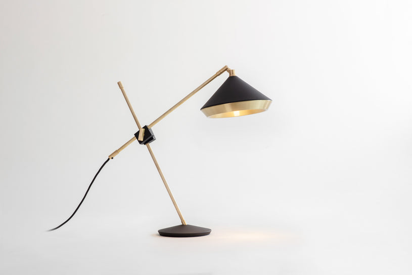 Timeless task lamp crafted from brass and turned metal. A brushed finish on the inner shade produces a soft, warm light. Adjustable for height, reach and angle.