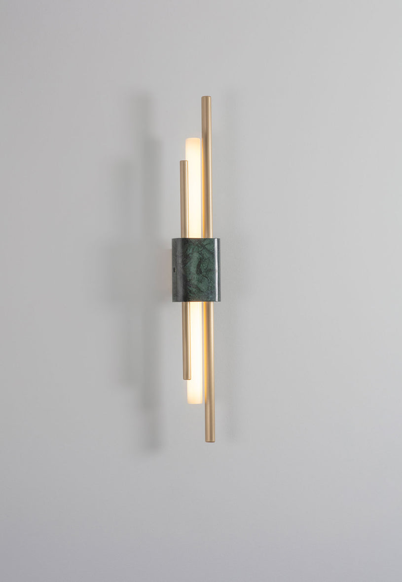 If you need a long, slim light – perhaps to position between windows – Tanto fits the bill. Our aim was to create an abstract, modernist light in traditional age-old lighting materials. Brass, marble, glass.