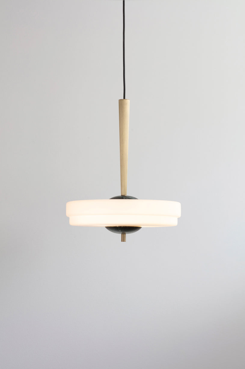 Suspended from a reeded, fluted brass stem, the two-tier, soft-finish, opal glass shade with spherical marble detailing produces a soft, ambient light. Warm and welcoming.